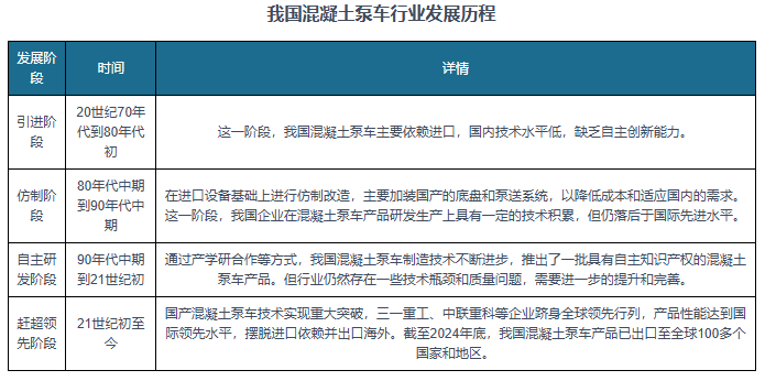 按照不雅研演讲网发布的《中国混凝土泵车行业现状深度研究取投资前景预测演讲(2025-2032年)》显示,混凝土泵车是操纵压力将混凝土沿管道持续输送的机械,由泵体和输送管构成。按布局形式,其能够分为活塞式、挤压式、水压隔阂式。我国混凝土泵车行业成长起步于20世纪70年代,成长过程能够分为引进、仿制、自从研发、赶超领先四个阶段。具体如下。